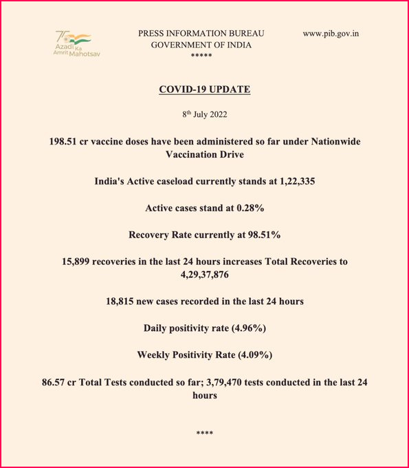 தற்போது நாடு முழுவதும் கொரோனா தொற்றால் பாதிக்கப்பட்ட 1,22,335 பேருக்கு மருத்துவமனையில் சிகிச்சை அளிக்கப் படுகிறது. சிகிச்சை பெறுவோர் விகிதம் 0.28% ஆக உள்ளது.