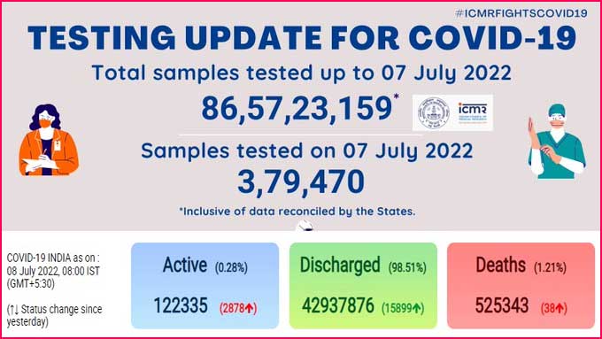நாடு முழுவதும் இதுவரை 86,57,23,169 மாதிரிகள் சோதனை செய்யப்பட்டு உள்ளது. நேற்று ஒரே நாளில் 3,79,470 மாதிரிகள் சோதனை செய்யப்பட்டுள்ளது.