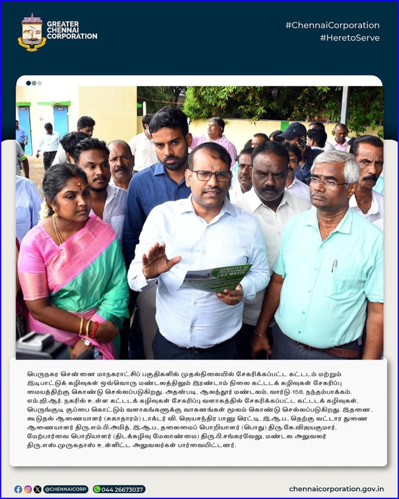 , முதற்கட்டமாக, கட்டிடம் மற்றும் இடிபாட்டுக் கழிவுகள் உருவாகும் இடத்தில் அகற்றும் நடவடிக்கையாக ஆலந்தூர் மண்டலம், நந்தம்பாக்கம், உட்கிரீக் கவுண்டி முதல் பிரதான சாலையில் கொட்டப்பட்டுள்ள கட்டிட இடிபாட்டுக் கழிவுகள் அகற்றும் நடவடிக்கைகள் பார்வையிடப்பட்டது. அங்குள்ள கட்டிடக் கழிவுகளை அகற்றி வாகனத்தில் ஏற்றி, இரண்டாம் நிலையான ஆலந்தூர் மண்டலத்தில் உள்ள சேகரிப்பு மையத்திற்கு கொண்டு செல்லப்பட்டது.