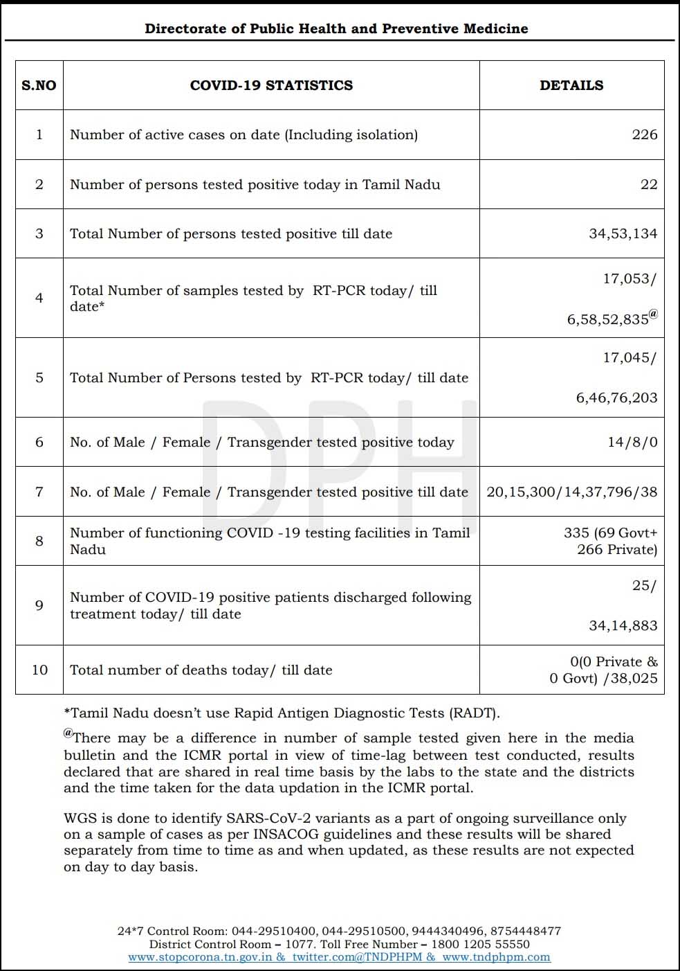 12/04/2022: தமிழ்நாட்டில் கொரோனா பாதிப்பு 22 ஆக குறைந்தது…