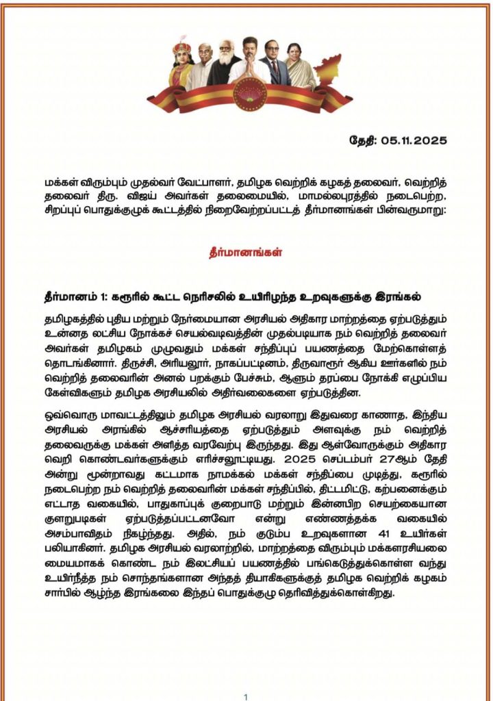 சென்னையை அடுத்த மாமல்லபுரத்தில் உள்ள தனியார் மண்டபத்தில், விஜய் தலைமையில் தமிழக வெற்றிக் கழகத்தின் சிறப்பு பொதுக்குழுக் கூட்டம் இன்று காலை நடைபெற்றது. இந்த கூட்டத்தில் 2000-க்கும் மேற்பட்ட பொதுக்குழு உறுப்பினர்கள் கலந்துகொண்டனர். சுமார் காலை 10.30 மணிக்கு தொடங்கியது. அப்போது , கரூர் தவெக பரப்புரை கூட்ட நெரிசலில் சிக்கி உயிரிழந்த 41 பேருக்கு, அக்கட்சியின் சிறப்பு பொதுக்குழுவில் மௌன அஞ்சலி செலுத்தப்பட்டது. பின்னர் பொதுக்கூட்டத்தில் தீர்மானம் நடைபெற்றது.