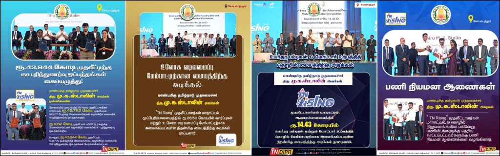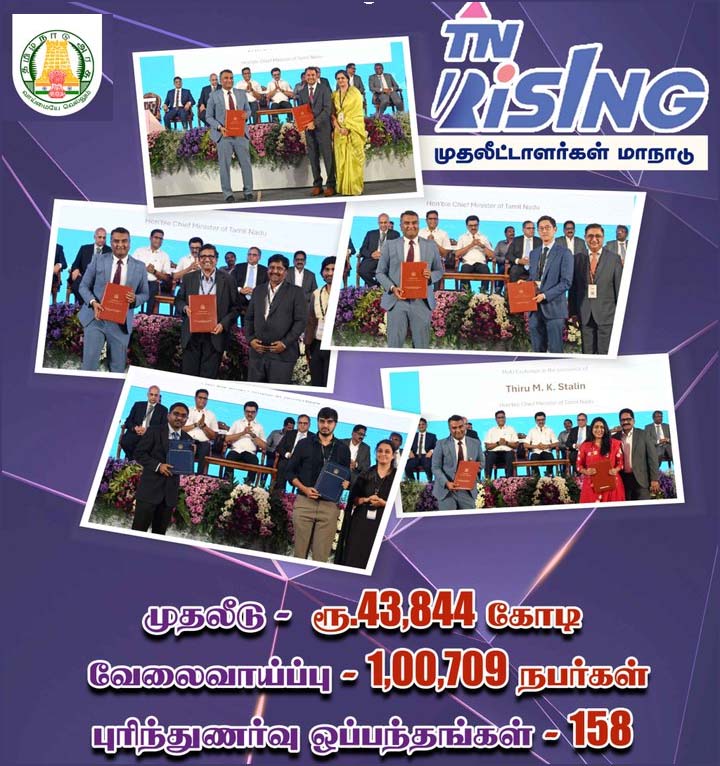 தமிழ்நாடு முதலமைச்சர் மு.க.ஸ்டாலின் முன்னிலையில் இன்று  தொழில், முதலீட்டு ஊக்குவிப்பு மற்றும் வர்த்தகத் துறை சார்பில் கோயம்புத்தூரில் நடைபெற்ற TN Rising முதலீட்டாளர்கள் மாநாட்டில், 42 ஆயிரத்து 792 கோடி ரூபாய் முதலீட்டில், 96 ஆயிரத்து 207 நபர்களுக்கு வேலைவாய்ப்புகள் வழங்கிடும் வகையில் 111 புரிந்துணர்வு ஒப்பந்தங்களும், குறு, சிறு மற்றும் நடுத்தரத் தொழில் நிறுவனங்கள் துறையின் சார்பில், 1,052 கோடி ரூபாய் முதலீட்டில் 4,502 நபர்களுக்கு வேலைவாய்ப்புகள் வழங்கிடும் வகையில் 47 புரிந்துணர்வு ஒப்பந்தங்களும், என மொத்தம், 43 ஆயிரத்து 844 கோடி ரூபாய் முதலீட்டில் 1 லட்சத்து 709 நபர்களுக்கு வேலைவாய்ப்பு வழங்கிடும் வகையில் 158 புரிந்துணர்வு ஒப்பந்தங்கள் மேற்கொள்ளப்பட்டன.