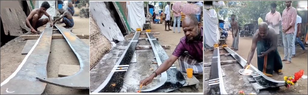 சிவகங்கை: மதுரை அழகர் கோயிலில் உள்ள பதினெட்டாம்படி கருப்பணசாமிக்கு சுமார் 450 கிலோ எடையுடன், 18.5 அடி உயர அரிவாள் நேர்த்தி கடனமாக செலுத்தப்பட்டது. இந்த அரிவாள் சிவகங்கை மாவட்டம் சிங்கம்புணரியில் உள்ள பட்டறையில் செய்து, அதை பக்தர்கள் காணிக்கையாக செலுத்தும் வீடியோ வைரலாகி வருகிறது.
