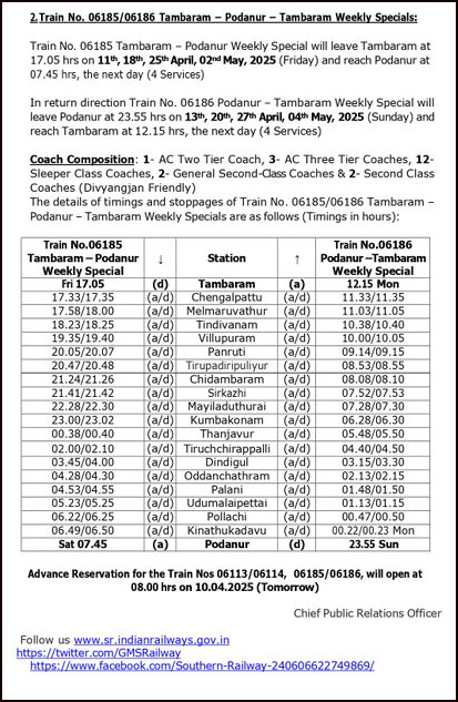 இன்று முதல் 12ஆம் தேதி வரை பொன்னேரி-கவரைப்பேட்டை இடையிலான தண்டவாள பராமரிப்பு பணி காரணமாக ரெயில்கள் ரத்து செய்யப்பட்டுள்ளது.