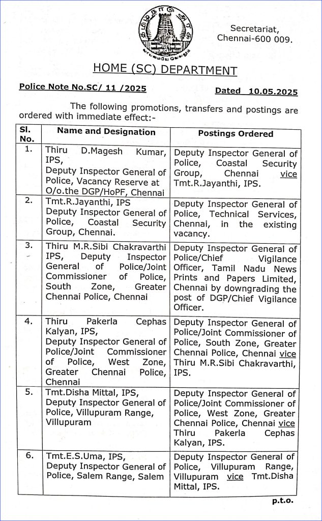 இதுகுறித்து தமிழக உள்துறை செயலாளர் தீரஜ்குமார் வெளியிட்டுள்ள அறிக்கையில், சென்னை தலைமையக டிஐஜி மகேஷ்குமார், தமிழ்நாடு கடலோர பாதுகாப்பு குழும டிஐஜியாகவும், தமிழ்நாடு கடலோர பாதுகாப்பு குழும டிஐஜி ஜெயந்தி, சென்னை காவல் தொழில்நுட்ப பிரிவு டிஐஜியாகவும் நியமிக்கப்பட்டுள்ளனர்