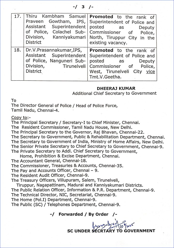 குளச்சல் ஏஎஸ்பி கம்பம் சாமுவேல் பிரவீன் கவுதம், பதவி உயர்வு பெற்று திருப்பூர் நகர் வடக்கு துணை ஆணையராக நியமிக்கப்பட்டு உள்ளார்.