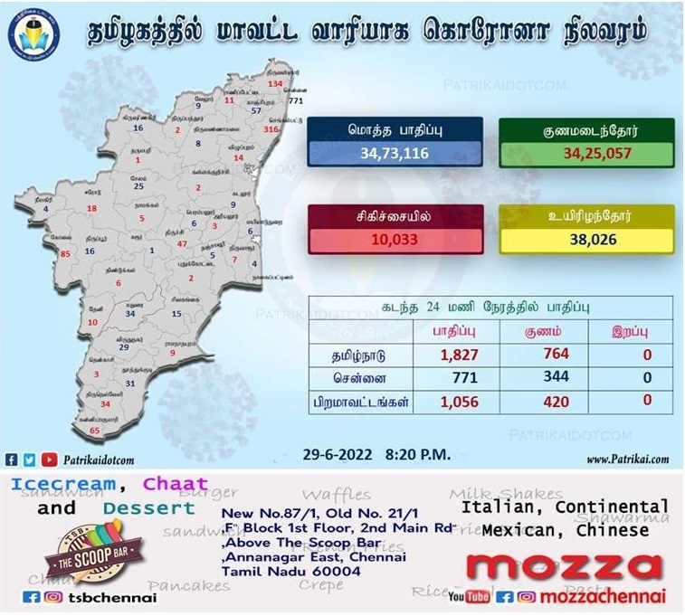 தமிழகத்தில் இன்று அனைத்து மாவட்டங்களிலும் புதிதாக கொரோனா பாதிப்பு உறுதி செய்யப்பட்டுள்ளது.