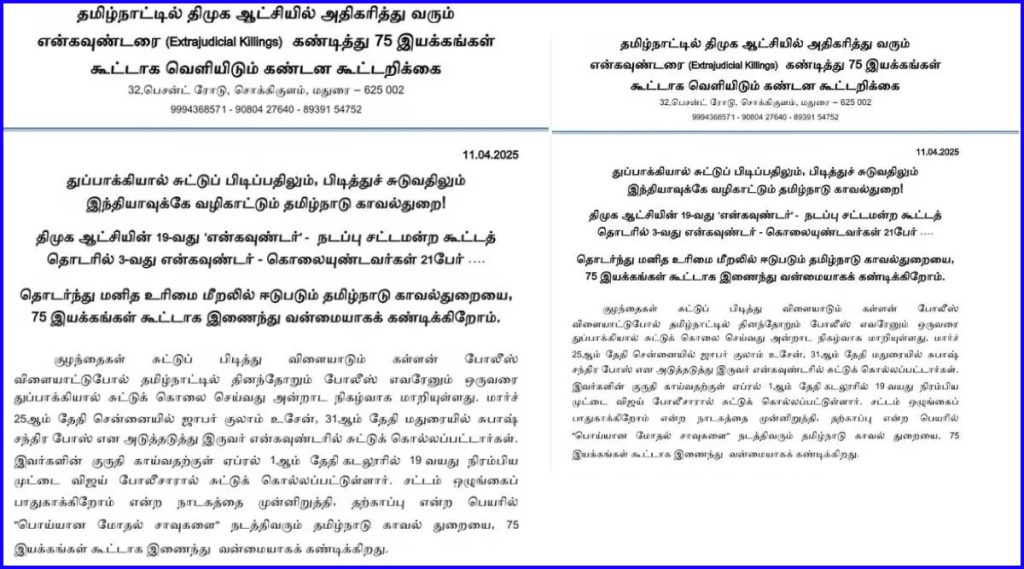 “திமுக ஆட்சியில் நடந்த 19 என்கவுண்டரில் 21 பேர் கொல்லப்பட்டதாகவும், கைது செய்தபின்பு குற்றவாளிகளை போலீசார் சுட்டுக்கொல்வது அதிகரிப்ப தாகவும்” அதிகார திமிருடன் இந்த என்கவுண்டர்கள் நடைபெற்றுள்ளதாகவும், இதுவரை இல்லாத அளவுக்கு அதிகம் என்று குற்றம்சாட்டி, பல்வேறு அமைப்புகள், மனித உரிமை செயல்பாட்டாளர்கள் 75 பேர் கையெழுத்திட்டு கூட்டறிக்கை வெளியிடப்பட்டுள்ளது.