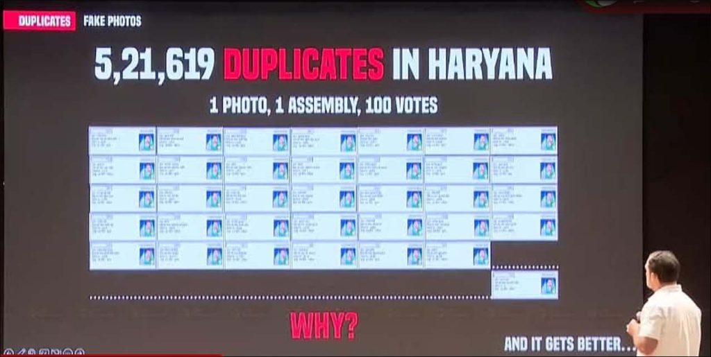 ஹரியானாவில் 22 முறை வாக்களித்த வாக்காளரின் புகைப்படம் பிரேசிலைச் சேர்ந்த மாடல் ஒருவருடையது. ஹரியானாவில் மொத்த வாக்காளர்கள் 2 கோடி பேர், திருடப்பட்ட வாக்குகள் எண்ணிக்கை 25 லட்சம். ஹரியானாவில் மொத்தம் உள்ள வாக்குகளில் 12.5 சதவீதம் வாக்குகள் திருடப்பட்டுள்ளன. 8ல் ஒரு வாக்கு ஹரியானா சட்டமன்ற தேர்தலில் திருடப்பட்டது. ஹரியானாவில் ஒரே ஒரு புகைப்படத்துடன் ஒரு சட்டமன்ற தொகுதியில் 100 வாக்குகள் இடம்பெற்றுள்ளது.