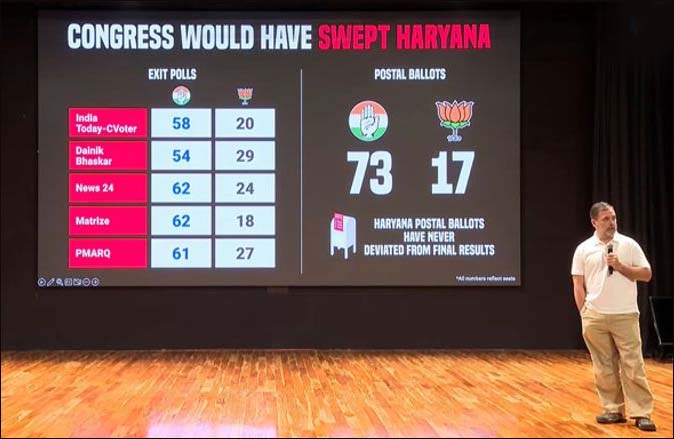 பல கருத்துகணிப்புகள் காங்கிரஸ் வெற்றி பெறும் என கூறியிருந்தன. ஆனால் முடிவு வேறாக இருந்தது. மோசடிகள் நடக்காமல் இருந்திருந்தால் ஹரியானா சட்டமன்ற தேர்தலில் காங்கிரஸ் வெற்றி பெற்றிருக்கும். வரலாற்றில் முதல்முறையாக தபால் வாக்குகளுக்கும், EVM வாக்குகளுக்கும் தொடர்பே இல்லாமல் இருந்தது. வாக்கு மோசடி முடிவுகளை பார்த்து அதிர்ச்சி அடைந்தேன். ஆட்சியையே எப்படி திருடியுள்ளார்கள் என்பதை புள்ளி விவரங்கள் மூலம் அம்பலப்படுத்தப் போகிறேன்.