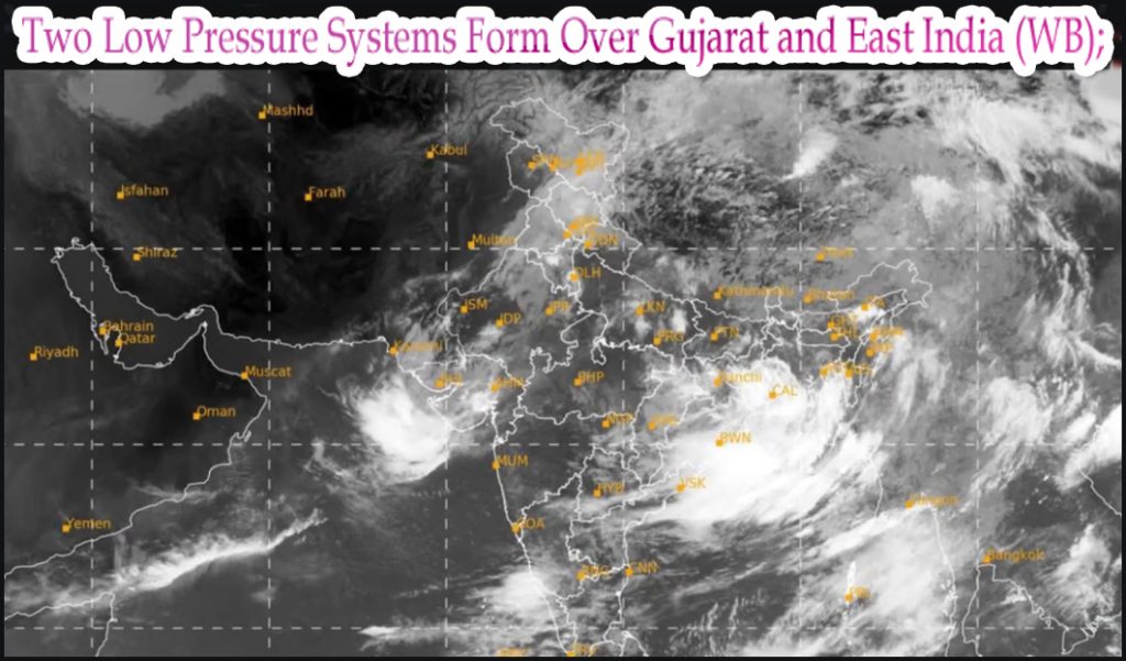 னிலை ஆய்வுத் துறை (IMD) இரண்டு குறைந்த காற்றழுத்தத் தாழ்வுப் பகுதிகள் உருவாகியுள்ளதாக அறிவித்துள்ளது, ஒன்று தென்மேற்கு வங்காளதேசம் மற்றும் கங்கை மேற்கு வங்காளத்தின் மீதும், மற்றொன்று குஜராத் மற்றும் அதன் சுற்றுப்புறங்களில். இந்த அமைப்புகள் தீவிரமடைந்து அடுத்த 24 மணி நேரத்தில் முறையே மேற்கு-வடமேற்கு மற்றும் வடக்கு-வடமேற்கு நோக்கி நகரும் என்று எதிர்பார்க்கப்படுகிறது.