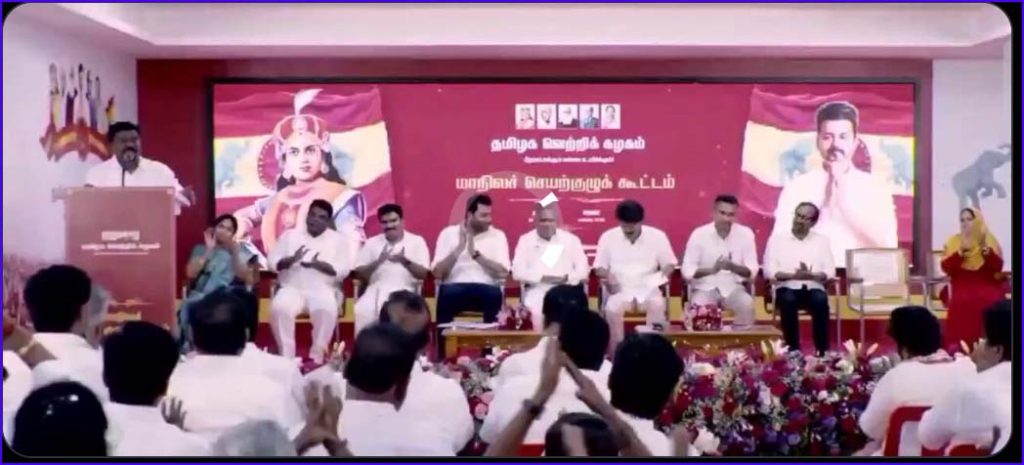 . தமிழக வெற்றிக் கழகத்தின் தலைவர் விஜய் தலைமையில் கட்சியின் செயற்குழுக் கூட்டம் சென்னை பனையூரில் உள்ள கட்சி அலுவலகத்தில் நடைபெற்றது. இதில் கட்சியின் நிர்வாகிகள், பொறுப்பாளர்கள், செயற்குழு உறுப்பினர்கள் இதில் கலந்துகொண்டுள்ளனர். இந்த கூட்டத்தில் கட்சியின் பணிகள், முதல்வர் வேட்பாளர் என பல்வேறு தீர்மானங்கள் நிறைவேற்றப்பட்டுள்ளன. மேலும், 2026 பேரவைத் தேர்தலில் தமிழக வெற்றிக் கழகத்தின் முதல்வர் வேட்பாளர் விஜய் என்றும் கூட்டணி குறித்து விஜய்க்கு முழு அதிகாரம் வழங்கப்படுவதாகவும் தவெக செயற்குழுக் கூட்டத்தில் முடிவெடுக்கப்பட்டுள்ளது.