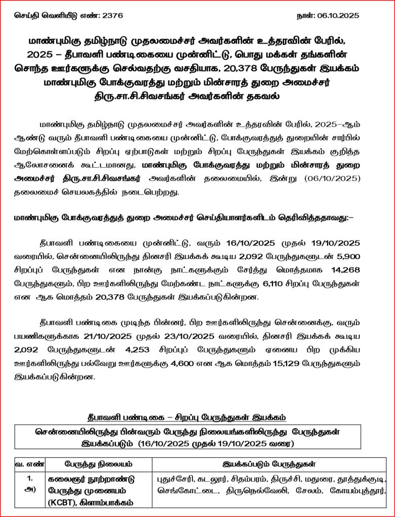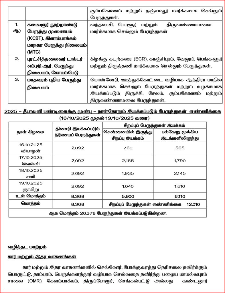 4நாள்களில் மொத்தம் 20,378 பேருந்துகள் இயக்கப்படவுள்ளன. தீபாவளி பண்டிகை முடிந்த பின்னா், பிற நகரங்களில் இருந்து சென்னை வரும் பயணி களுக்காக அக்.21 முதல் 23 வரை வழக்கமாக இயக்கப்படும் 6,276 பேருந்துகளுடன், 4,253 சிறப்பு பேருந்துகள் இயக்கப்படவுள்ளன. மேலும், சென்னையைத் தவிா்த்து பிற நகரங்களுக்கு 4,600 சிறப்பு பேருந்துகள் என மொத்தம் 15,129 பேருந்துகள் இயக்கப்படவுள்ளன.