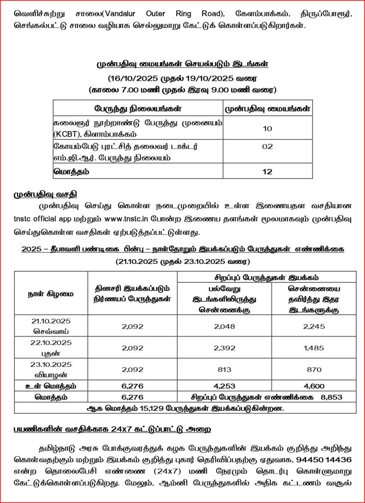 முன்பதிவு மையங்கள்: கிளாம்பாக்கம் பேருந்து முனையத்தில் 10, கோயம்பேடு பேருந்து நிலையத்தில் 2 என 12 முன்பதிவு மையங்கள் அமைக்கப்பட்டுள்ளன. இந்த மையங்கள் அக்.16 முதல் 19 வரை காலை 7 முதல் இரவு 9 மணி வரை செயல்படும். இதுதவிர, ஏற்கெனவே நடைமுறையில் உள்ள செயலி மற்றும்  இணைதளம் மூலமும் முன்பதிவு செய்துகொள்ளலாம்.