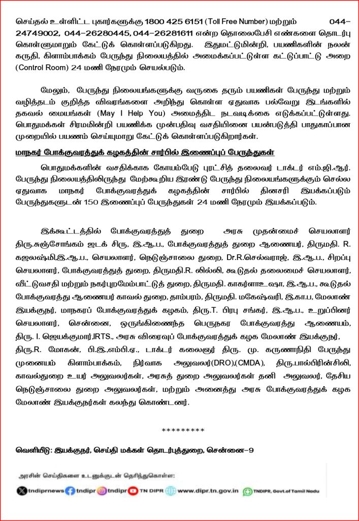 இதுதொடர்பாக, தலைமைச் செயலகத்தில்  தமிழ்நாடு போக்குவரத்து மற்றும் மின்சாரத் துறை அமைச்சர்எஸ்.எஸ். சிவசங்கர்   தலைமையில் எதிர்வரும் 2025-ஆம் ஆண்டு தீபாவளி பண்டிகையை முன்னிட்டு, போக்குவரத்துத் துறையின் சார்பில் மேற்கொள்ளப்படும் சிறப்பு ஏற்பாடுகள் மற்றும் சிறப்பு பேருந்துகள் இயக்கம் குறித்த ஆலோசனைக் கூட்டம் நடைபெற்றது.