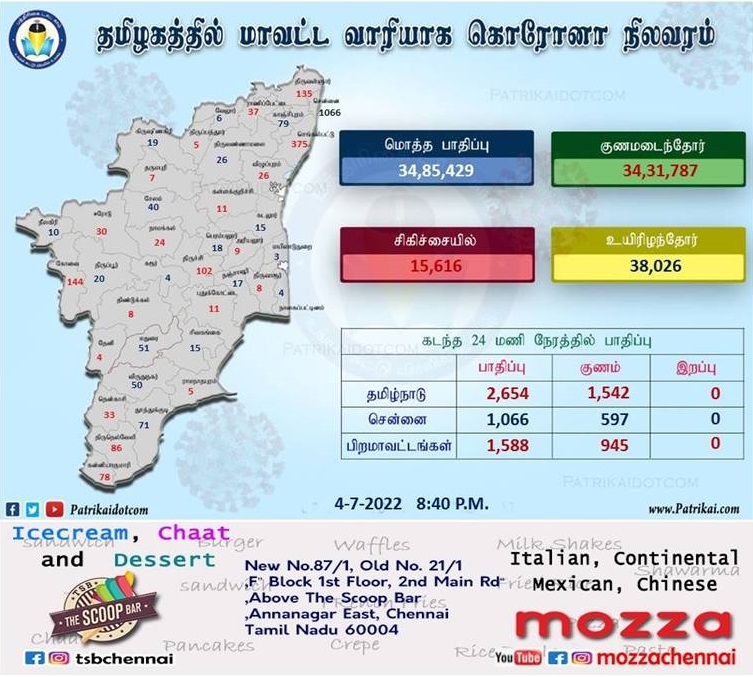 ராமநாதபுரம் மற்றும் திருப்பத்தூரில் தலா 5 பேருக்கும், தேனி, நாகப்பட்டினம் மற்றும் கரூரில் தலா 4 பேருக்கும், மயிலாடுதுறை 3 பேருக்கும் கொரோனா உறுதியாகியுள்ளது.