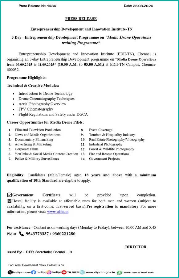 இந்த நிலையில், தற்போது தொழில்முனைவோர்களுக்கு 3 நாட்கள் டிரோன் பயிற்சி அளிக்கப்பட உள்ளதாக அறிவிப்பு வெளியிடப்பட்டுஉள்ளது. அதன்படி, வரும் 09.09.2025 முதல் 11.09.2025 தேதி வரை காலை 10.00 மணி முதல் மதியம் 5.00 மணி வரை நடைபெற உள்ளது.
