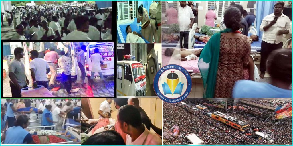 விஜய் கரூர் பிரசார கூட்ட நெரிசலில் சிக்கி பலியானோர் எண்ணிக்கை 36 ஆக உயர்ந்துள்ளது. கரூர் விஜய் பிரசாரத்தில் கூட்ட நெரிசல் 8 குழந்தைகள், 16 பெண்கள் உட்பட 36 பேர் உயிரிழப்பு மேலும் 50க்கும் மேற்பட்டோர் காயமுடன் சிகிச்சை பெற்று வருவதாக கூறப்படுகிறது. இந்த சோக சம்பவம் நாடு முழுவதும் அதிர்வலைகளை ஏற்படுத்தி உள்ளது. இந்த சம்பவத்துக்கு குடியரசு தலைவர் முர்மு, பிரதமர் மோடி, ஆளுநர் ரவி, காங்கிரஸ் தலைவர் கார்கே, பிரியங்கா காந்தி உள்பட வடமாநில அரசியல் தலைவர்கள், தமிழ்நாடு எதிர்க்கட்சி தலைவர் எடப்பாடி உள்பட தமிழக அரசியல் கட்சி தலைவர்கள் இரங்கல் தெரிவித்து உள்ளார்.