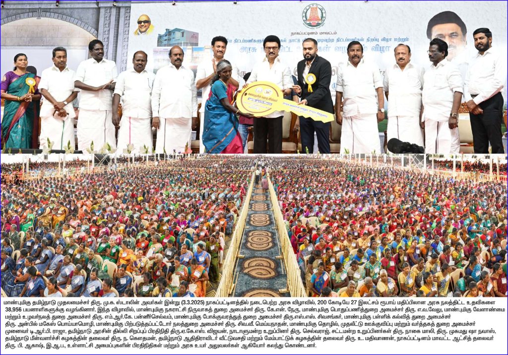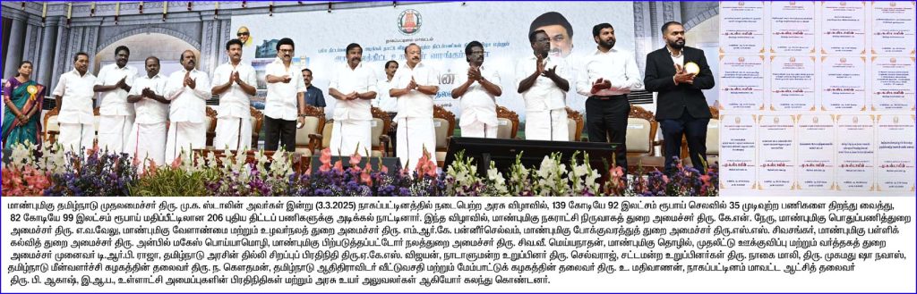 நாகப்பட்டினத்தில்  நடந்த அரசு விழாவில் முதல்வர் மு.க.ஸ்டாலின், ரூ.139 கோடியே 92 லட்சம் மதிப்பில் 35 திட்டப்பணிகளை திறந்து வைத்து, ரூ.82கோடியே 99லட்சம் மதிப்பில் 206 பணிகளுக்கு அடிக்கல் நாட்டி, 38,956 பயனாளிகளுக்கு ரூ.200 கோடியே 27லட்சத்து 31ஆயிரத்து 700 மதிப்பிலான நலத்திட்ட உதவிகளை வழங்கினார்.