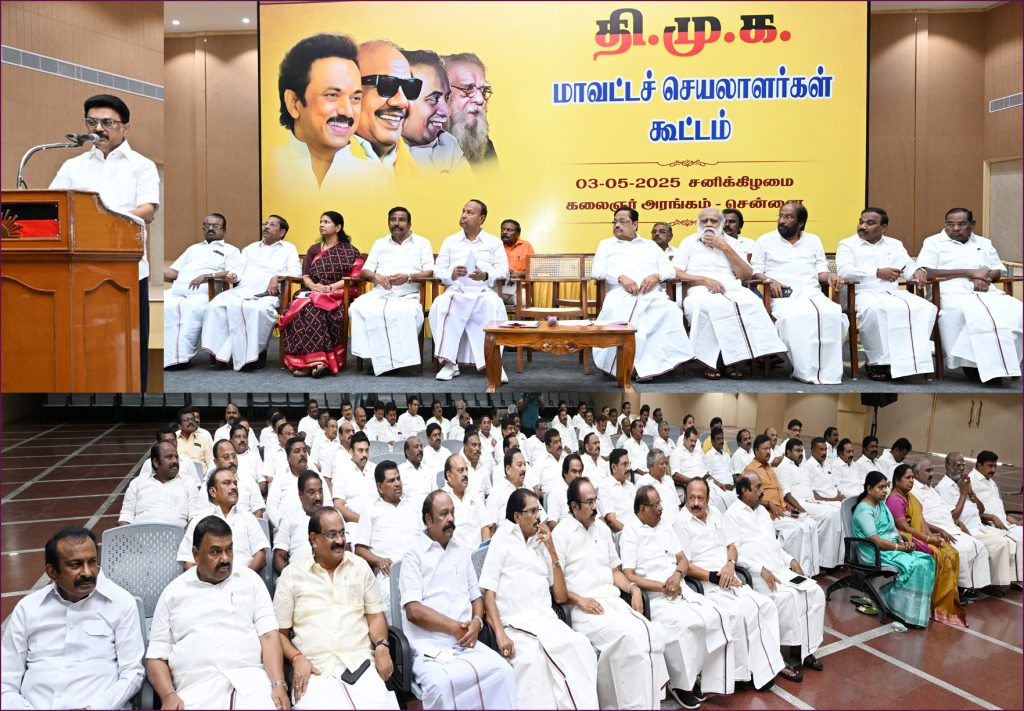 அதோடு, வரலாற்றில் மீண்டும் மாநில சுயாட்சிக்காக மாண்பமை உச்சநீதிமன்ற நீதியரசர் குரியன் ஜோசப் அவர்கள் தலைமையில் ஒரு உயர்மட்ட குழுவினை நியமித்துள்ள கழகத் தலைவரும் – முதலமைச்சருமான முத்துவேல் கருணாநிதி ஸ்டாலின் அவர்களுக்கு, மாவட்ட செயலாளர்களின் இந்த கூட்டம் உவகையுடனும் – பெருமை பொங்கவும் பாராட்டுதலைப் பதிவு செய்து கொள்கிறது. மேலும், ஐந்தாவது ஆண்டில் அடியெடுத்து வைக்கும் திராவிட மாடல் நாயகர் முதலமைச்சர் அவர்களுக்குத் துணையாகச் செயலாற்றி வரும் மாண்புமிகு துணை முதலமைச்சர் திரு.உதயநிதி ஸ்டாலின் அவர்களுக்கும்; அனைத்து அமைச்சர் பெருமக்களுக்கும் இம்மாவட்டக் கழகச் செயலாளர்கள் கூட்டம் வாழ்த்தும் – பாராட்டும் – நன்றியும் தெரிவித்துக் கொள்கிறது.
