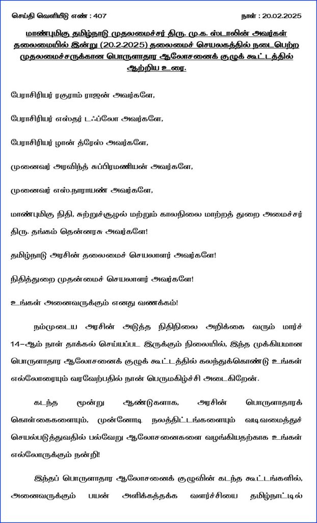 தமிழ் நாடு முதலமைச்சர் மு.க. ஸ்டாலின் தலைமையில் 20.2.2025 அன்று தலைமைச் செயலகத்தில் முதலமைச்சருக்கான பொருளாதார ஆலோசனைக் குழு கூட்டம் நடைபெற்றது. இதில் கலந்துகொண்டு பேசிய முதலமைச்சர் ஸ்டாலின், தமிழ்நாட்டில் 40லட்சம் பேருக்கு வேலை வழங்கப்பட்டு இருப்பதாக கூறினார். இந்த கூட்டத்தில் முதலமைச்சர் ஆற்றிய உரை வருமாறு :-