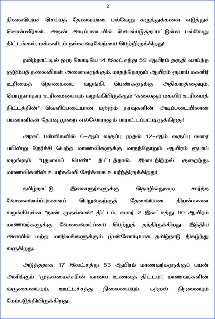 தமிழ்நாட்டில் ஒரு கோடியே 14 இலட்சத்து 59 ஆயிரம் தகுதி வாய்ந்த குடும்பத் தலைவிகள் அனைவருக்கும், மாதந்தோறும் ஆயிரம் ரூபாய் மகளிர் உரிமைத் தொகையை வழங்கி, பெண்களுக்கு அதிகாரத்தையும், பொருளாதார உரிமையையும் வழங்கியிருக்கும்;கலைஞர் மகளிர் உரிமைத் திட்டத்தின்;