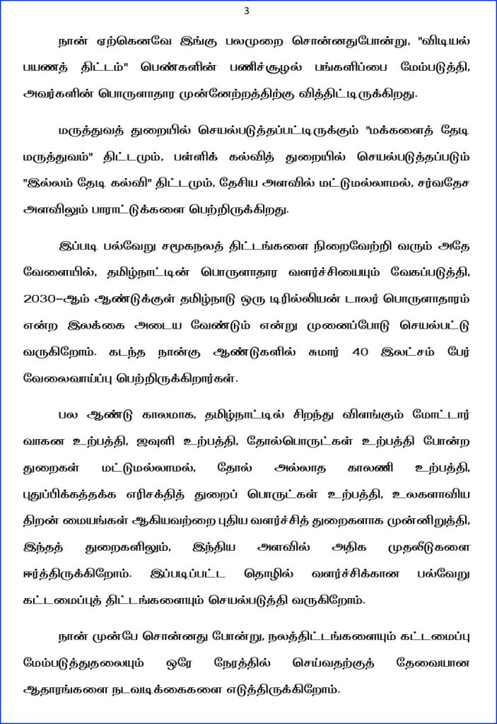பல ஆண்டு காலமாக, தமிழ்நாட்டில் சிறந்து விளங்கும் மோட்டார் வாகன உற்பத்தி, ஜவுளி உற்பத்தி, தோல்பொருட்கள் உற்பத்தி போன்ற துறைகள் மட்டுமல்லாமல், தோல் அல்லாத காலணி உற்பத்தி, புதுப்பிக்கத்தக்க எரிசக்தித் துறைப் பொருட்கள் உற்பத்தி, உலகளாவிய திறன் மையங்கள் ஆகியவற்றை புதிய வளர்ச்சித் துறைகளாக முன்னிறுத்தி, இந்தத் துறைகளிலும், இந்திய அளவில் அதிக முதலீடுகளை ஈர்த்திருக்கிறோம். இப்படிப்பட்ட தொழில் வளர்ச்சிக்கான பல்வேறு கட்டமைப்புத் திட்டங்களையும் செயல்படுத்தி வருகிறோம். நான் முன்பே சொன்னது போன்று, நலத்திட்டங்களையும் கட்டமைப்பு மேம்படுத்துதலையும் ஒரே நேரத்தில் செய்வதற்குத் தேவையான ஆதாரங்களை நடவடிக்கைகளை எடுத்திருக்கிறோம்.