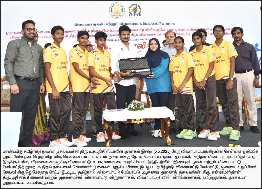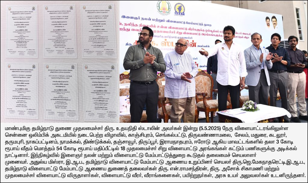 பின்னர்  நிகழ்ச்சியில் உரையாற்றிய துணை முதலமைச்சர் உதயநிதி ஸ்டாலின், “இந்த ஆண்டில் 40 தொகுதிகளில் மினி விளையாட்டு அரங்கம் அமைக்கப்படும். 2026 ஆம் ஆண்டு பிப்ரவரி மாதத்திற்குள் அவை பயன்பாட்டிற்கு வரும். இளம் வீரர்களை கண்டறிந்து பயிற்சி அளிக்க ஸ்டார் அக்காடமி அமைக்கப்பட்டுள்ளது. ஒவ்வொரு மாவட்டத்திற்கும் ஒரு விளையாட்டு அரங்கம் என தேர்வு செய்யப்பட்டு 38 மாவட்டங்களில் அமைக்கப்பட உள்ளது. 38 பயிற்சியாளர்கள் இதற்காக பணியில் அமர்த்தப்பட்டுள்ளனர்.
