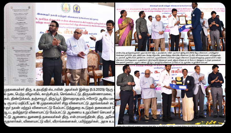 சென்னை நேரு உள் விளையாட்டரங்கில் து 39 விளையாட்டு வீரர்கள் மற்றும் பயிற்சியாளர்களுக்கு முதலமைச்சர் விருது வழங்கும் நிகழ்ச்சி மற்றும் 18 மினி விளையாட்டு அரங்கம் அமைப்பதற்கான அடிக்கல் நாட்டும் விழா நடைபெற்றது. இந்த நிகழ்ச்சியில் சிறப்பு விருந்தினராக விளையாட்டு துறை மற்றும் துணை முதலமைச்சர் மு.க.ஸ்டாலின் கலந்துகொண்டார்.