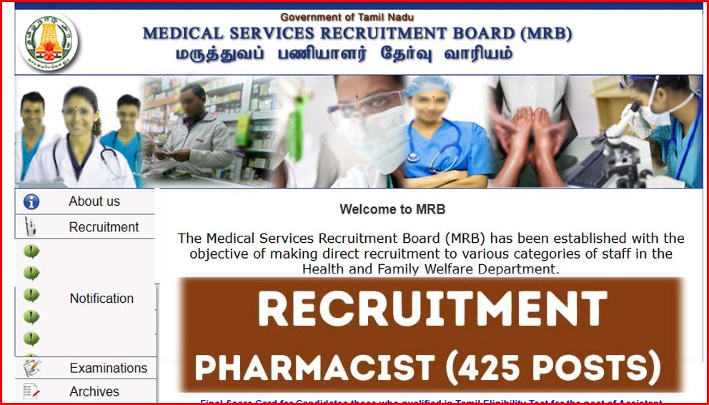 தமிழ்நாடு அரசின் மருத்துவ துறையில் 425 மருந்தாளுநர்(பார்மஸ்சிஸ்ட்) பணியிடங்கள் நிரப்புவதற்கான அறிவிப்பை மருத்துவ பணியாளர் தேர்வாணையம்(எம்ஆர்பி) வெளியிட்டுள்ளது. இப்பணியிடங்களுக்கு இன்று முதல் வரும் மார்ச் 10-ம் தேதி வரை www.mrb.tn.gov.in ஆன்லைன் மூலம் விண்ணப்பிக்கலாம் என்று தெரிவிக்கப்பட்டுள்ளது.