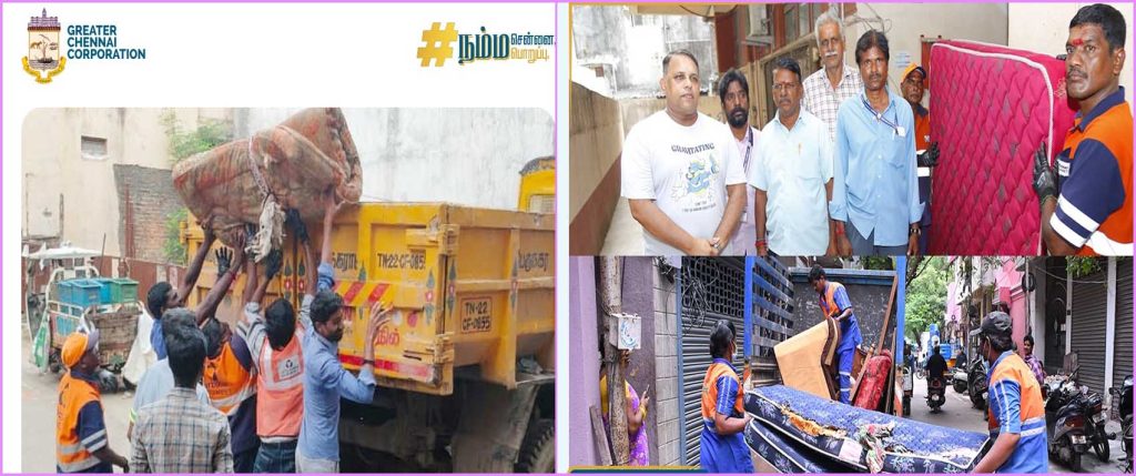 நாள்தோறும் சராசரியாக 6,500 மெட்ரிக் டன் திடக்கழிவுகளும், 1,000 மெட்ரிக் டன் கட்டடம் மற்றும் கட்டுமான இடுபாட்டுக் கழிவுகள் அகற்றப்பட்டு வருகிறது. இந்நிலையில் பொதுமக்கள் குப்பைகள் மட்டுமல்லாது, தங்களது வீட்டில் உள்ள பழைய சோஃபாக்கள், மெத்தைகள், மரச்சாமான்கள் மற்றும் உடைகளை பொது இடங்களில் கொட்டுவதைத் தவிர்த்திடும் விதமாக, பெருநகர சென்னை மாநகராட்சியின் சார்பில் ஒவ்வொரு சனிக்கிழமைகளிலும் பொதுமக்கள் முன்கூட்டியே தரும் தகவலின் அடிப்படையில், அவர்களின் வீடுகளிலிருந்து பழைய சோஃபாக்கள், மெத்தைகள், மரச் சாமான்கள் மற்றும் உடைகள் ஆகிய திடக்கழிவுகளை அகற்றிடும் புதிய நடவடிக்கை சென்னை மாநகராட்சியால் கடந்த மாதம் 11 ஆம் தேதி அன்று தொடங்கப்பட்டது.