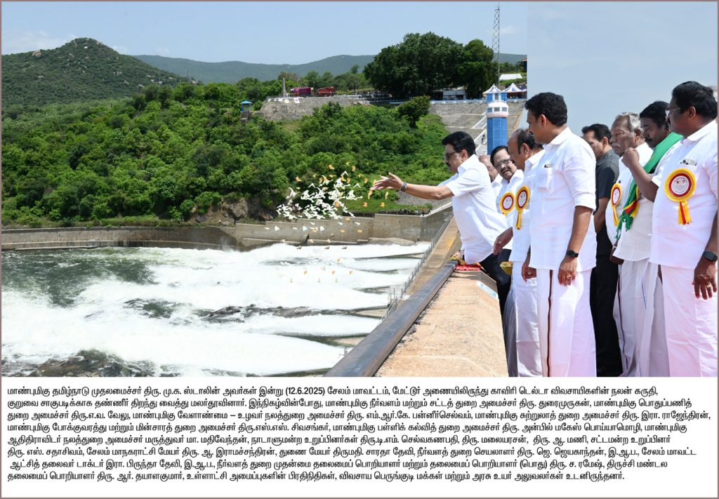 இரண்டு நாள் பயணமாக நேற்று மாலை சேலம் சென்ற முதல்வர், இரவு மேட்டூர் விருந்தினர் விடுதியில் தங்கி ஓய்வெடுத்தார். இன்று காலை மேட்டூர் அணையை பாசனத்திற்கு திறந்து வைத்தவர்,. அங்கு நடைபெற்ற நிகழ்ச்சியில் கலந்துகொண்டார். அப்போது, புதிய பணிகளுக்கு அடிக்கல் நாட்டி, நலத்திட்ட உதவிகளையும் முதலமைச்சர் மு.க.ஸ்டாலின் வழங்கினார்.
