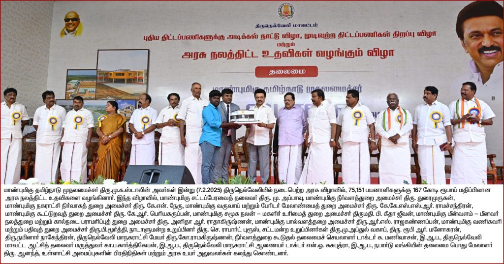 நம்முடைய திராவிட மாடல் ஆட்சி அமைந்த பிறகு திருநெல்வேலி மாவட்டத்திற்கு என்று ஏராளமான திட்டங்கள் நிறைவேற்றித் தரப்பட்டிருக்கிறது.