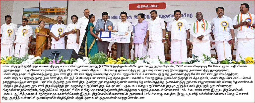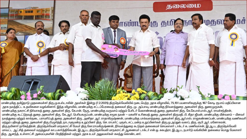 - பல்வேறு அரசுத் துறைகள் சார்பாக 75 ஆயிரத்து 151 பயனாளிகளுக்கு 167 கோடி ரூபாய் மதிப்பிலான நலத்திட்ட உதவிகள் வழங்கும் விழா