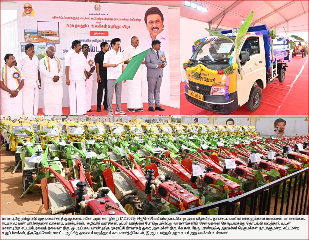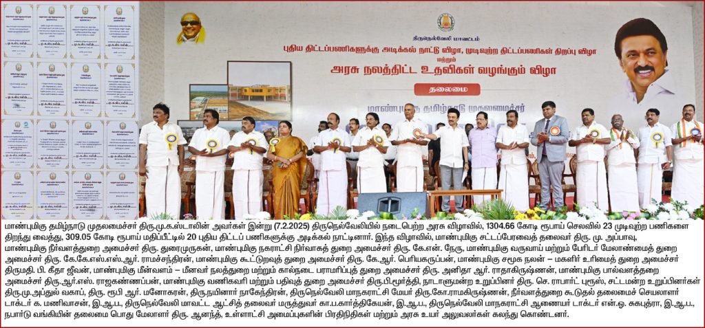 திருநெல்வேலி மாவட்டம், திருநெல்வேலி அரசு மருத்துவக் கல்லூரி மைதானத்தில் நடைபெற்ற அரசு விழாவில், 1304.66 கோடி ரூபாய் செலவில் 23 முடிவுற்ற பணிகளை திறந்து வைத்து, 309.05 கோடி ரூபாய் மதிப்பீட்டில் 20 புதிய திட்டப் பணிகளுக்கு முதலமைச்சர் மு.க.ஸ்டாலின் அடிக்கல் நாட்டினார். மேலும் 75,151 பயனாளிகளுக்கு 167 கோடி ரூபாய் மதிப்பிலான அரசு நலத்திட்ட உதவிகளை முதலமைச்சர் மு.க.ஸ்டாலின் வழங்கினார்.