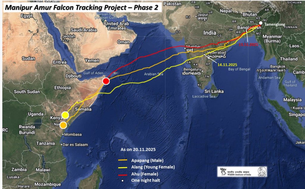 மணிப்பூர் காடுகளில் பிடிபட்ட மூன்று அமூர் பறவைகளின் முதுகில் செயற்கைகோள் உதவியுடன் டிராக் செய்யக்கூடிய சிப்களை பொருத்திய ஆராய்ச்சியாளர்கள் அவற்றை கடந்த வாரம் விடுவித்து தொடர்ந்து கண்காணித்தனர்.