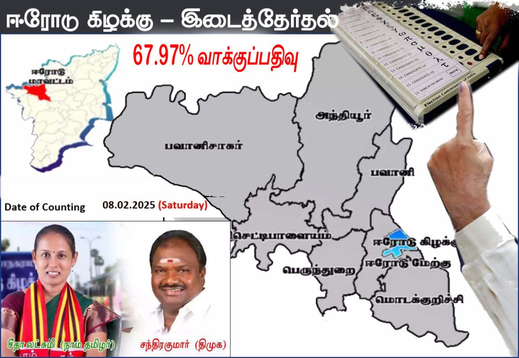 பிப்ரவரி 5ந்தேதி இடைத்தேர்தல் வாக்குப்பதிவு நடைபெற்று முடிந்த ஈரோடு கிழக்கு தொகுதியில் மாலை 5 மணி நிலவரப்படி 64.02% வாக்குகள் பதிவாகி உள்ளதாக மாவட்ட நிர்வாகம் தெரிவித்திருந்தது. அதன்பிறகும் மக்கள் ஆர்வமுடன் வாக்களித்த நிலையில், இறுதியாக 67.97 சதவீதம் வாக்குகள் பதிவாகியுள்ளன என தேர்தல் ஆணையம் தெரிவித்துள்ளது.