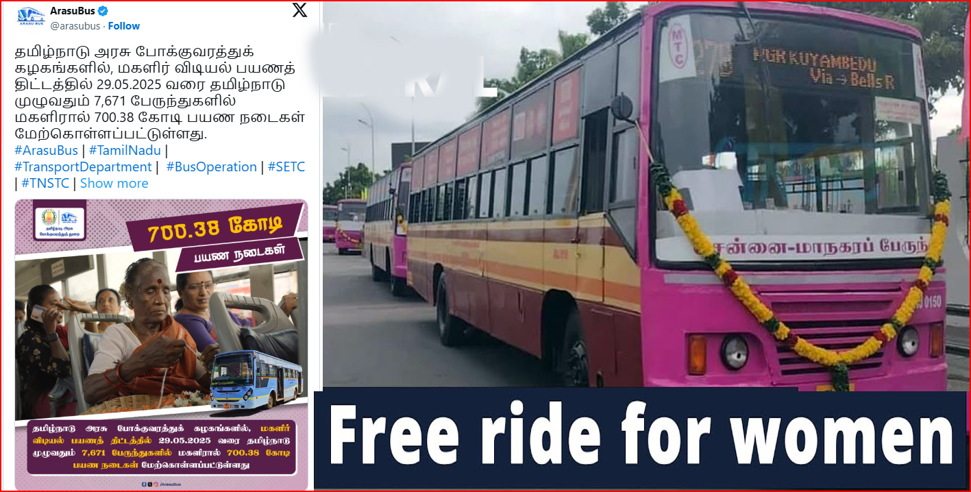 சென்னை: தமிழ்நாடு அரசு பெண்களுக்காக மாநிலம் முழுவதும் இயக்கி வரும் அரசு இலவச பேருந்துகளில் இதுவரை 700 கோடி பயணங்கள் நடைபெற்றுள்ளது என போக்குவரத்து துறை தெரிவித்து உள்ளது.