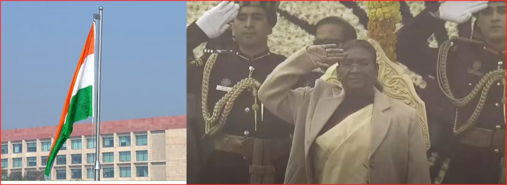 டெல்லியில் உள்ள கர்தவ்யா பாதையில் தேசியக் கொடி ஏற்றப்பட்டது. அதைத் தொடர்ந்து, உள்நாட்டிலேயே உருவாக்கப்பட்ட 105 மிமீ இலகுரக கள பீரங்கிகளைக் கொண்ட பீரங்கி ஆயுத அமைப்பைப் பயன்படுத்தி, முழக்கமிடும் 21 குண்டுகள் முழங்க தேசிய கீதம் இசைக்கப்பட்டது.