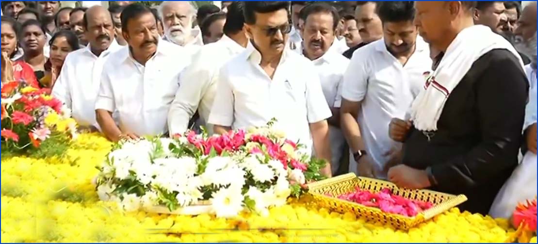 சென்னை: மறைந்த முன்னாள் முதல்வரும், திமுக தலைவருமான கருணாநிதியின் 7வது ஆண்டு நினைவு தினத்தையொட்டி, சென்னை மெரினாவில் உள்ள கருணாநிதி நினைவிடத்தில் முதல்வர் மு.க.ஸ்டாலின் அஞ்சலி மலர்தூவி அஞ்சலி செலுத்தினார்.