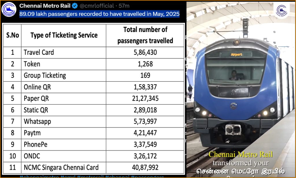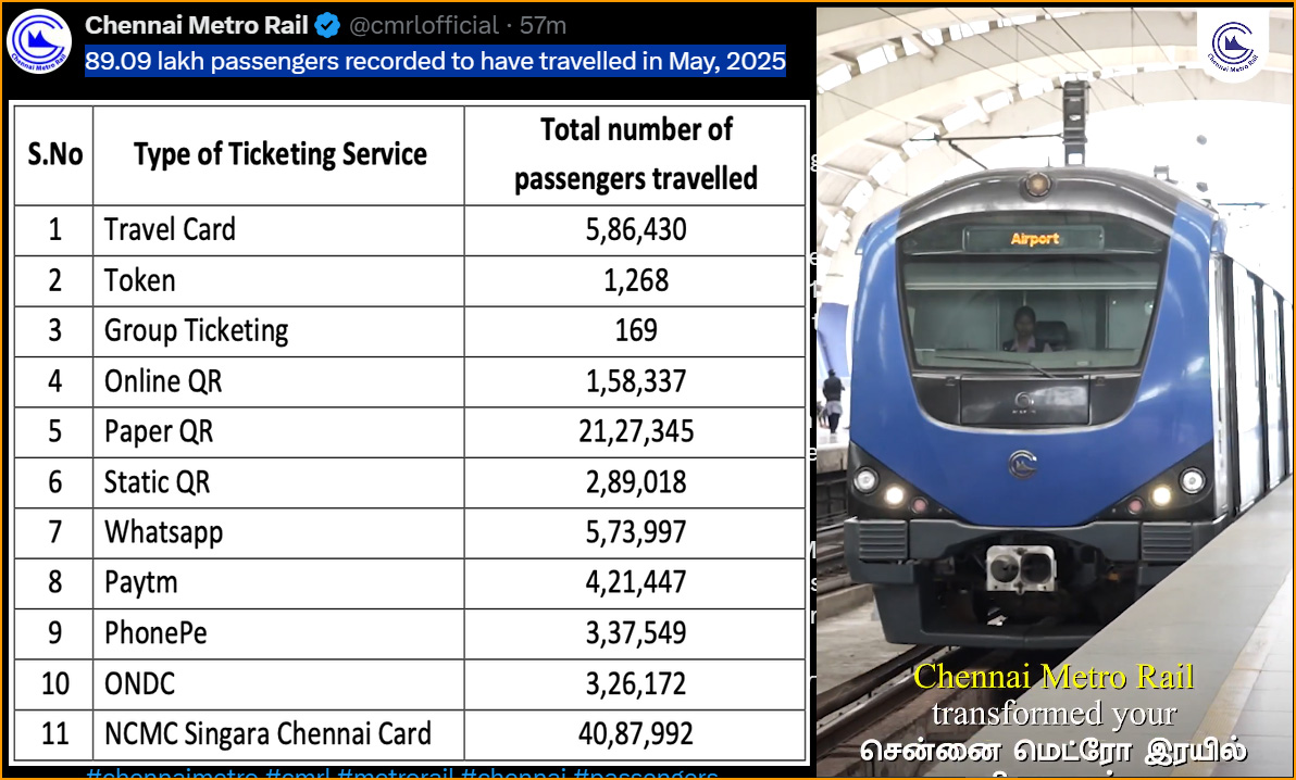 சென்னை மெட்ரோ ரயில் நிறுவனம், சென்னையில் உள்ள மக்களுக்கும், மெட்ரோ ரயில் பயணிகளுக்கும் போக்குவரத்து வசதியை அளித்து வருவதோடு நம்பகத் தன்மையான பாதுகாப்பான வசதியை வழங்கி வருகிறது. அந்த வகையில் 2025 ஆம் ஆண்டு மே மாதத்தில் 89,09,724 பயணிகள் மெட்ரோ ரயில்களில் பயணித்துள்ளனர்.