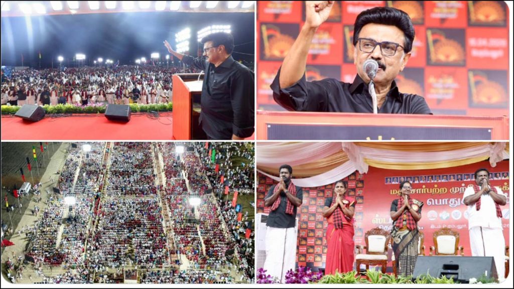 ஆனால், இதைவிட அதுதான் முக்கியம். நம்முடைய உணர்வுதான், நம்முடைய உரிமைதான் முக்கியம். எனவே, அதற்கு செல்ல வேண்டுமென்று நான் கேட்டுக்கொண்டதன் காரணமாக இன்றைக்கு அவர்கள் டெல்லிக்கு சென்றிருக்கிறார்கள். எனவே, நம்முடைய எம்.பி.-க்களின் குரலாக, அந்தக் கறுப்புச் சட்டத்தைத் திரும்பப் பெறுவதற்கு அவர்கள் குரல் கொடுக்க இருக்கிறார்கள். அங்கு நாளைய தினம் வாக்கெடுப்பு நடைபெற இருக்கிறது. எனவே அவர்களின் சார்பிலும் உங்களிடத்தில் நான் கேட்டுக் கொள்ள விரும்புகிறேன். நன்றாகப் புரிந்து கொள்ளுங்கள், ஏதோ நான் முதலமைச்சரோ, 30 பேர் அமைச்சரோ, நம்முடைய கூட்டணியில் 200 பேர் எம்.எல்.ஏ.-வோ ஆக வேண்டும் என்பது மட்டுமல்ல; நம்முடைய தமிழ்நாட்டைக் காக்க, கழகம்தான் மீண்டும் ஆட்சி அமைக்க வேண்டும். தொகுதி மறுவரையறையை அடுத்து இவர்கள் இன்னும் மோசமான திட்டங்களை வைத்திருக்கிறார்கள்.