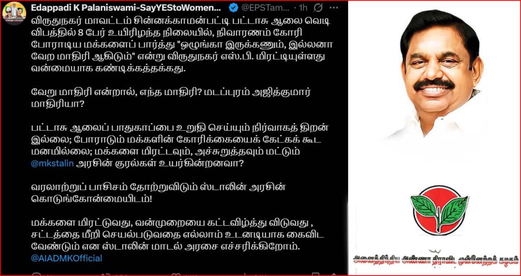 இது தொடர்பாக எடப்பாடி பழனிச்சாமி, தனது எக்ஸ் பக்கத்தில் பகிர்ந்த பதிவில், “விருதுநகர் மாவட்டம் சின்னக்காமன்பட்டி பட்டாசு ஆலை வெடி விபத்தில் 8 பேர் உயிரிழந்த நிலையில், நிவாரணம் கோரி போராடிய மக்களைப் பார்த்து “ஒழுங்கா இருக்கணும், இல்லனா வேற மாதிரி ஆகிடும்” என்று விருதுநகர் எஸ்.பி. மிரட்டியுள்ளது வன்மையாக கண்டிக்கத்தக்கது.