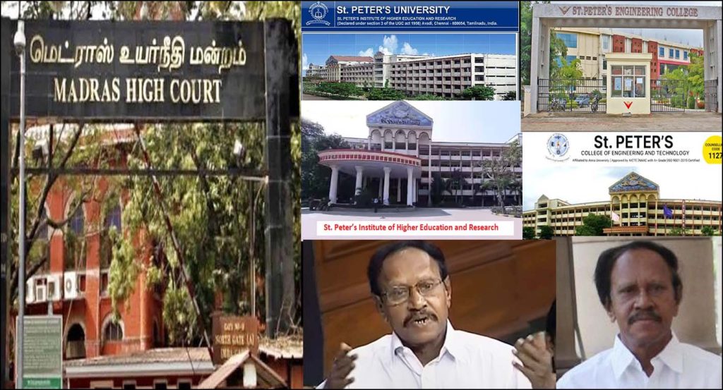 சென்னை ஆவடி மாநகராட்சிக்கு உட்பட்ட பருத்திப்பட்டு கோனம்பேடு கிராம பொது நல சங்கத்தின் தலைவரான ஜி.கருணாநிதி என்பவர் சென்னை உயர் நீதிமன்றத்தில் கடந்த 2021-ம் ஆண்டு பொதுநல வழக்கு தொடுத்திருந்தார். அவரது மனுவில், “எங்கள் கிராமத்தில் அதிமுக எம்.பி. தம்பிதுரைக்கு சொந்தமான செயின்ட் பீட்டர்ஸ் உயர் கல்வி மற்றும் ஆராய்ச்சி நிறுவனம் சார்பில் கலை அறிவியல் கல்லூரி, பொறியியல் கல்லூரி, ஆசிரியர் பயிற்சி மையம் உள்ளிட்ட கல்வி நிறுவனங்கள் செயல்பட்டு வருகின்றன.