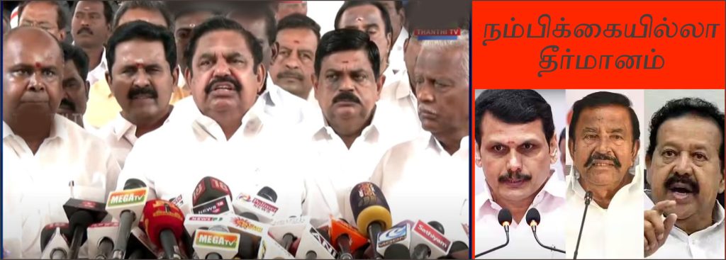 இதைத்தொடர்ந்து, இன்று மீண்டும், அமைச்சர்கள் நேரு, பொன்முடி, செந்தில் பாலாஜிமீது அதிமுக நம்பிக்கையில்லா தீர்மானம் கொண்டு வந்த எதிர்க்கட்சி தலைவரும், முன்னாள் முதல்வருமனா எடப்பாடி பழனிச்சாமி, அதுகுறித்து விவாதிக்க வலியுறுத்தினார். அமைச்சர்கள் செந்தில் பாலாஜி, பொன்முடி, கே.என்.நேரு ஆகிய 3 அமைச்சர்கள் மீது நம்பிக்கையில்லா தீர்மானம் கொண்டுவர அனுமதி கேட்டு கடிதம் கொடுத்துள்ளோம் என அதிமுகவினர் சபாநாயகரிடம் முறையீடு செய்தார்கள். இதற்கு பதில் அளித்த சபாநாயகர் அப்பாவு, “அரைமணி நேரத்திற்கு முன்னதாக கடிதம் கொடுத்தீர்கள், அது பரிசீலனையில் உள்ளது. நான் என்னுடைய முடிவை சொல்லவில்லை. ஏற்கனவே அலுவல் நிறைய இருக்கிறது அதனால் இன்று எடுக்க முடியாது” என்று தெரிவித்தார்.
