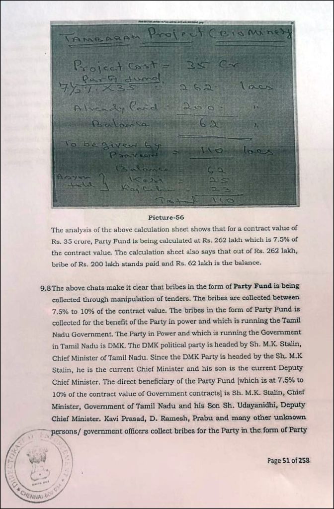 அதில், 51-வது பக்கத்தில் டெண்டர்களுக்கான 7.5% -10% வரையிலான கமிஷன்(Party Fund) என்ற பெயரில் வசூலிக்கப்பட்டுள்ளதாகவும் பகிரங்கமாக குற்றம்சாட்டியுள்ளது. அமைச்சர், அவரது மகனை காப்பாற்றவே காவல்துறை FIR பதிவு செய்யாமல் இருப்பதாகவும் சாடியுள்ளது.
