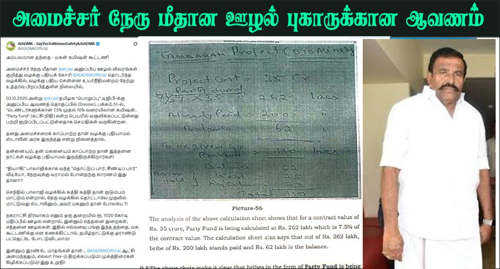 அம்பலமான தந்தை – மகன் கமிஷன் கூட்டணி அமைச்சர் நேரு மீதான அமலாக்கத்துறை   அனுப்பிய ஊழல் விவரங்கள் குறித்து வழக்கு பதியக் கோரி அஇஅதிமுக சார்பில்   தொடர்ந்த வழக்கில், வழக்கு பதிய சென்னை உயர்நீதிமன்றம் நேற்று உத்தரவு பிறப்பித்துள்ள நிலையில், 03.12.2025 அன்று அமலாக்கத்துறை ,   தமிழக “பொறுப்பு” டிஜிபி-க்கு அனுப்பிய ஆவணத் தொகுப்பில் (Dossier), பக்கம் 51-ல், “டெண்டர்களுக்கான 7.5% முதல் 10% வரையிலான கமிஷன், “Party Fund” (கட்சி நிதி) என்ற பெயரில் வசூலிக்கப்பட்டுள்ளது” பற்றி குறிப்பிடப்பட்டுள்ளதாக செய்திகள் வருகின்றன.