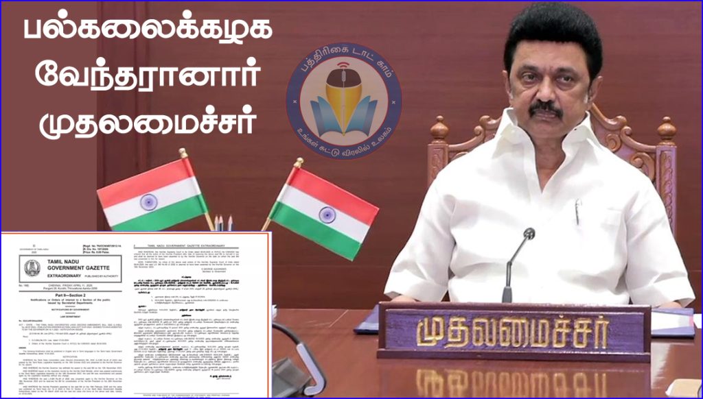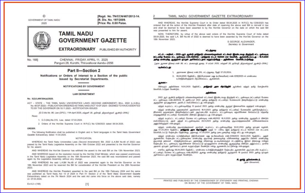 இந்த நிலையில், இந்த நிலையில் தமிழ்நாடு அரசின் பல்கலைக்கழக வேந்தர் மற்றும் துணைவேந்தர் நியமனம் தொடர்பான  10 மசோதாக்களும் சட்டமானது. இதுகுறித்து தமிழ்நாடு  அரசிதழில் வெளியிடப்பட்டுள்ளது.