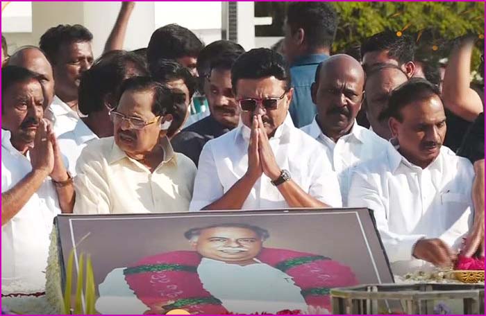 அண்ணா நினைவிடத்தில் மரியாதை செலுத்திய பின்பு கலைஞர் நினைவிடத்தில் முதலமைச்சர் மு.க.ஸ்டாலின் மரியாதை செலுத்தினார்.