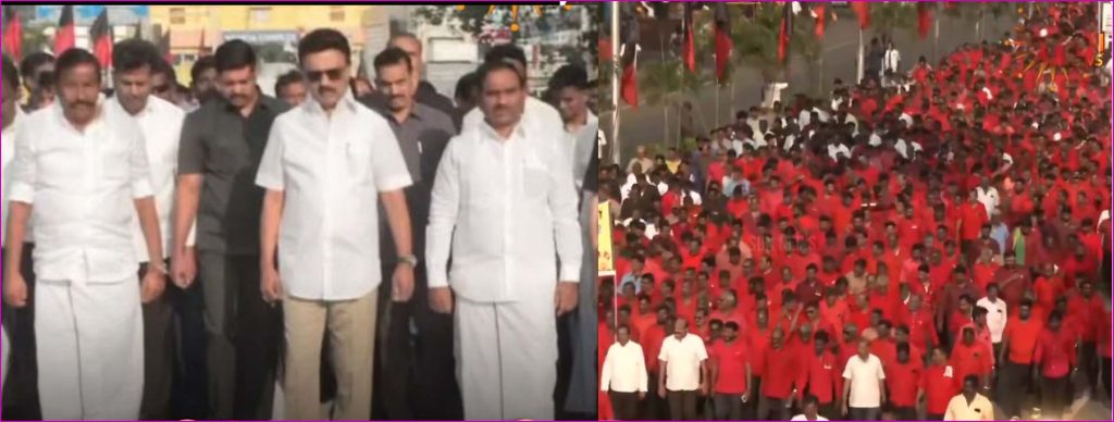 முன்னதாக,  மு.க.ஸ்டாலின்,   ஓமந்தூரார் அரசினர் தோட்டத்தில் உள்ள அண்ணா சிலைக்கு மாலை அணிவித்து முதலமைச்சர் மு.க.ஸ்டாலின் அமைதிப் பேரணியை தொடங்கினார். பேரணியில் அமைச்சர்கள், எம்.பி., எம்.எல்.ஏ.க்கள், தொண்டர்கள் பங்கேற்றனர். எம்.பி.க்கள் தயாநிதி மாறன், ஆ.ராசா, அமைச்சர்கள் நேரு, சேகர்பாபு பங்கேற்றனர்.
